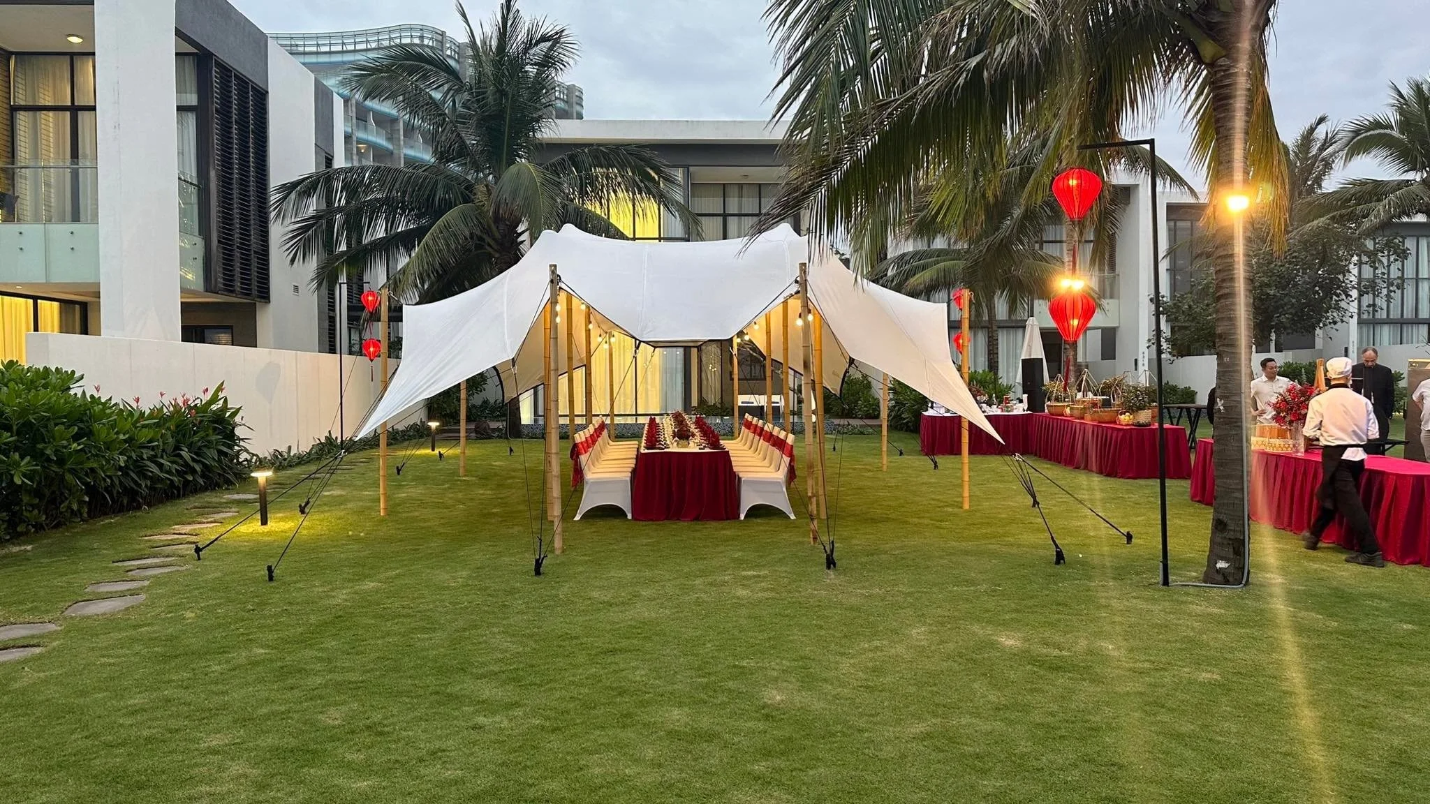 Your dream beachside wedding in Vietnam becomes reality with our custom stretch tents. Choose open sides for natural airflow or close them for an intimate, cosy setting.